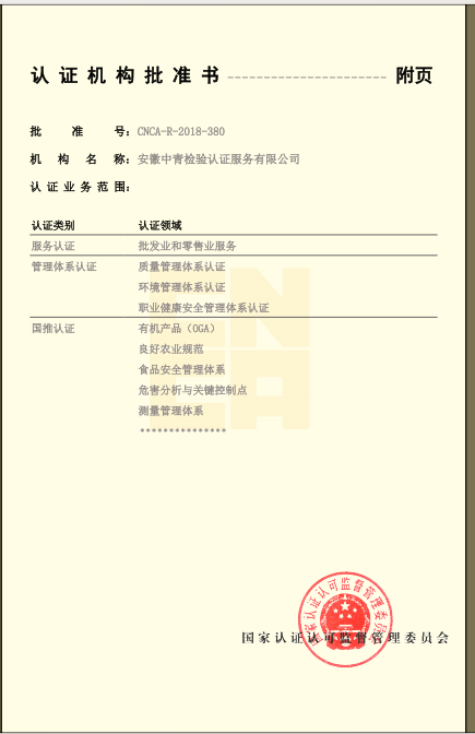 安徽省“食安安徽”品牌認證:評價是根據國際通行的合格評定方式,依據“食安安徽”品牌認證評價標準及相關規(guī)定,對申請“食安安徽”認證評價的食品生產經營者和特定區(qū)域進行的第三方認證評價活動。“食安安徽”品牌認證評價標準包括企業(yè)認證和區(qū)域評價兩大類,企業(yè)認證對象包括食用農產品生產者、食品生產企業(yè)、食品流通企業(yè)、餐飲服務企業(yè),區(qū)域評價對象包括食品生產基地、食品生產園區(qū)、餐飲安全街區(qū)、食品安全小鎮(zhèn)、安徽省食品安全示范縣(市、區(qū))。